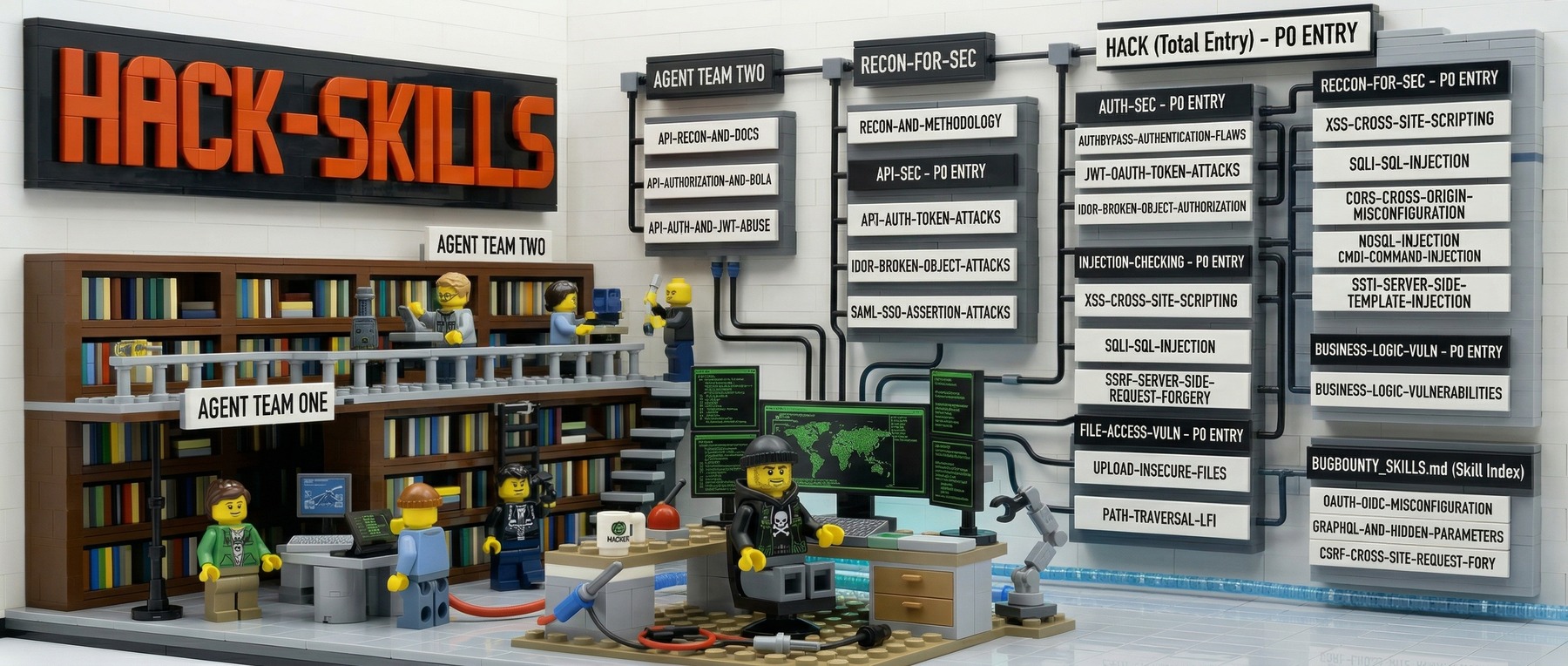 One master entry, six category routers, and 100+ deep topic skills — drilled down on demand by your agent. Static, auditable, install in a single command.